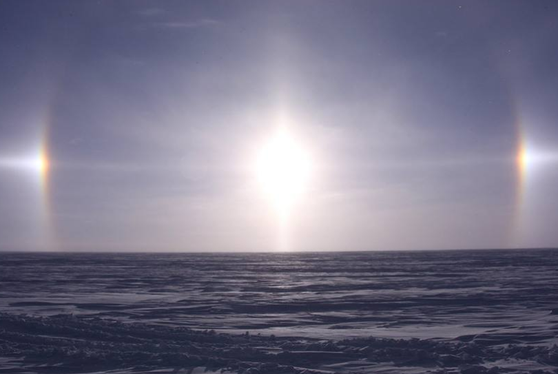 幻日(sun dogs)是大氣的一種光學(xué)現(xiàn)象。在天空出現(xiàn)的半透明薄云里面,有許多飄浮在空中的六角形柱狀的冰晶體,偶爾它們會(huì)整整齊齊地垂直排列在空中。當(dāng)太陽(yáng)光射在這一根根六角形冰柱上,就會(huì)發(fā)生非常規(guī)律的折射現(xiàn)象。