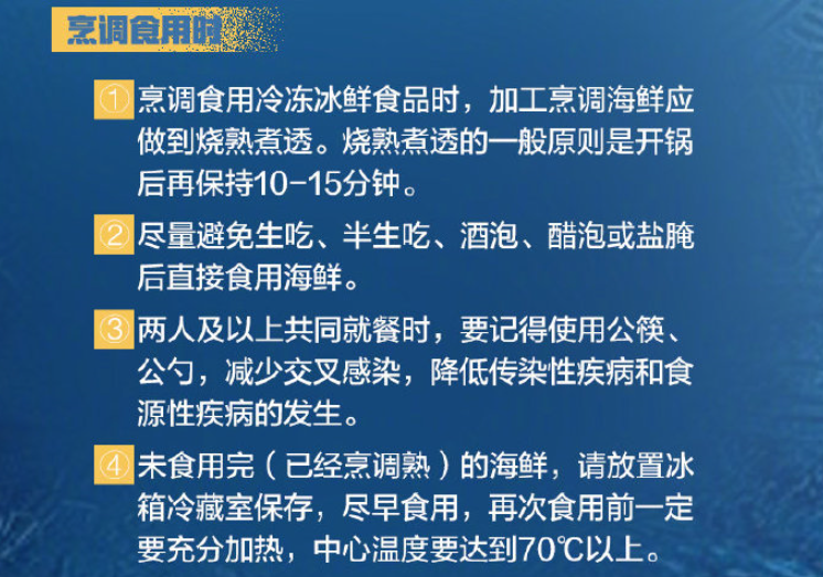 烹調(diào)食用冷凍冰鮮食品時(shí),加工烹調(diào)海鮮應(yīng)做到燒熟煮透。燒熟煮透的一般原則是開鍋后再保持10-15分鐘。