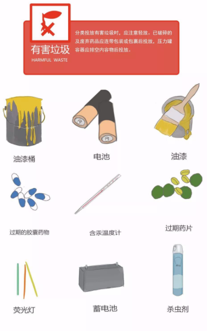 常見包括廢電池、廢熒光燈管、廢燈泡、廢水銀溫度計、廢油漆桶、過期藥品、過期化妝品等。有害有毒垃圾需特殊正確的方法安全處理。