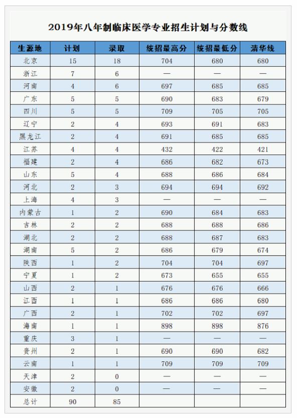 2019年北京協(xié)和醫(yī)學(xué)院八年制臨床醫(yī)學(xué)專(zhuān)業(yè)高考招生計(jì)劃90名,根據(jù)教育部的政策取消了二次招生。實(shí)際高招錄取85名,其中有全省排名前10的考生5名、全國(guó)生物和化學(xué)競(jìng)賽金牌保送生5名。
